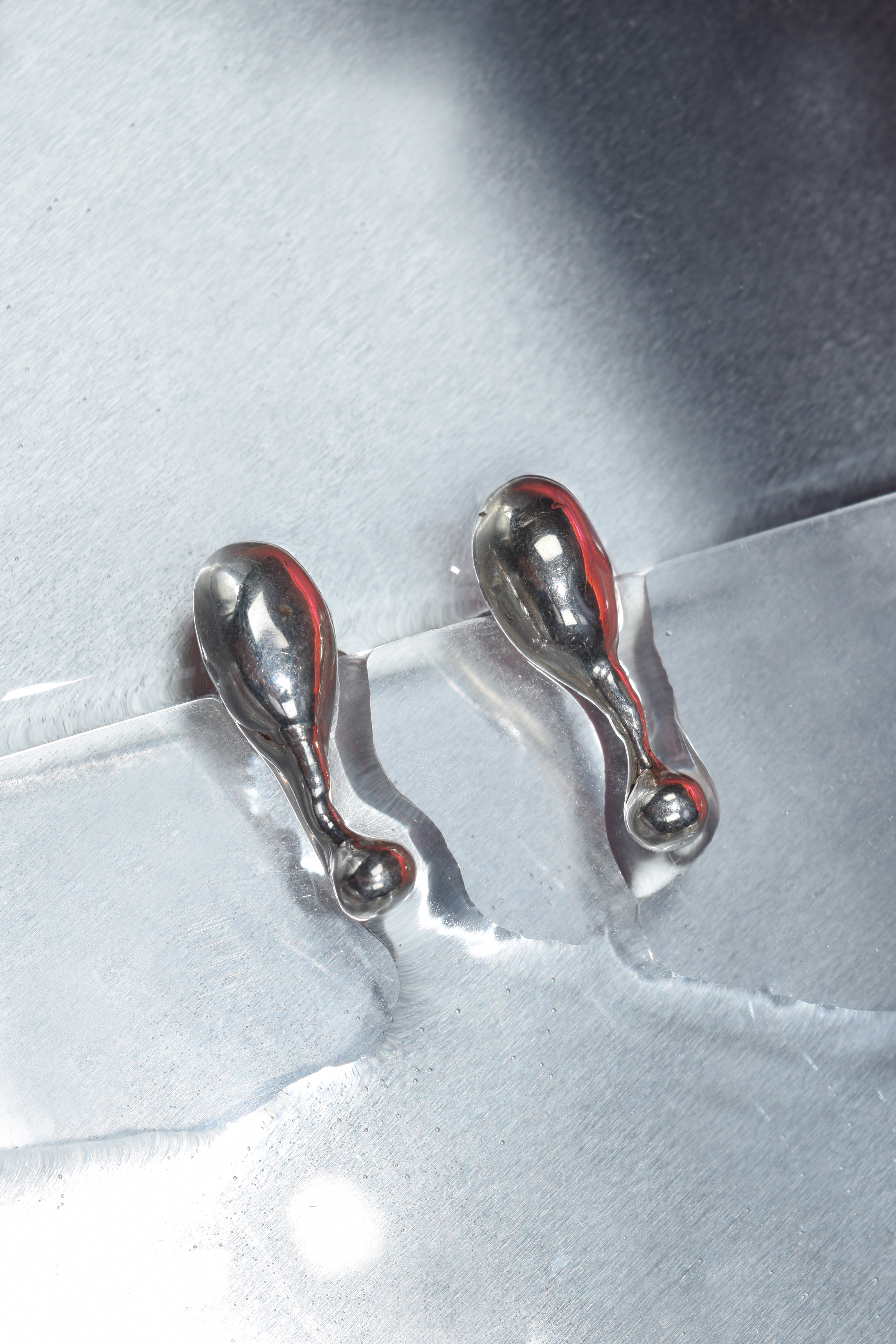 Each piece has been sculpted freely by water thanks to a hot liquid wax poring technique and finally casted in solid metal.
